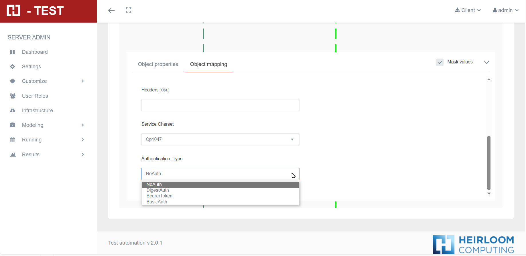 Authentication Type: allows selecting the type of authentication that the service requires. Once selected, it allows us to enter the necessary data for the type of authentication selected. No authentication type is used by default.