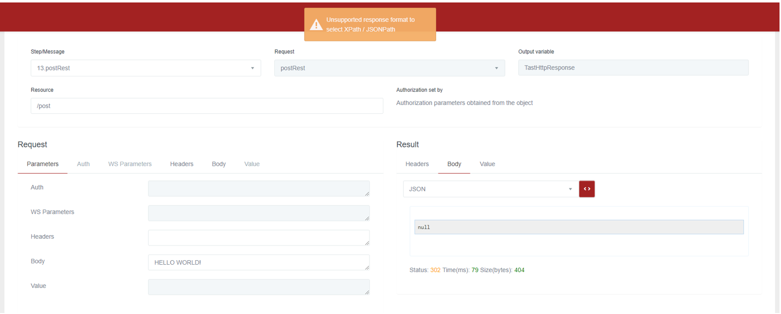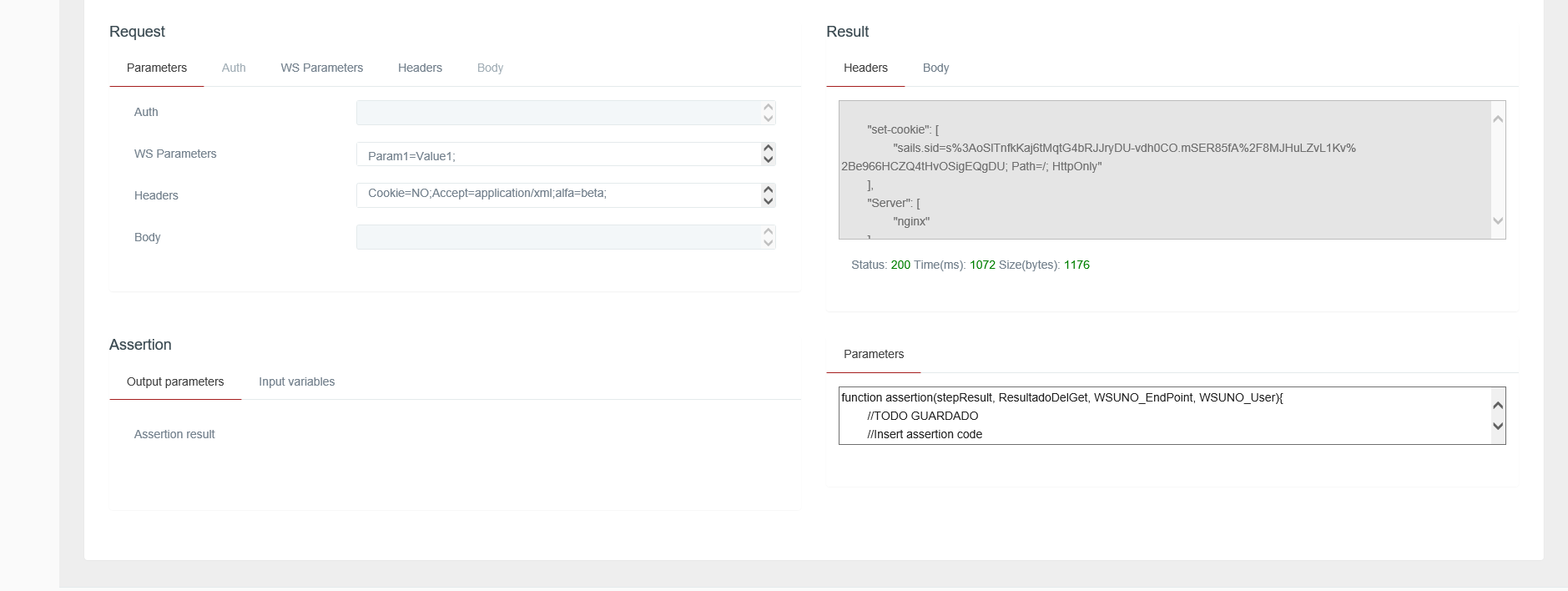 By the moment, there are no specific assertions defined for REST messages. It is therefore necessary that said assertion functions have at least two parameters: the first will be the value of the stepResult, and the second will contain the value of the result of the execution of the request.