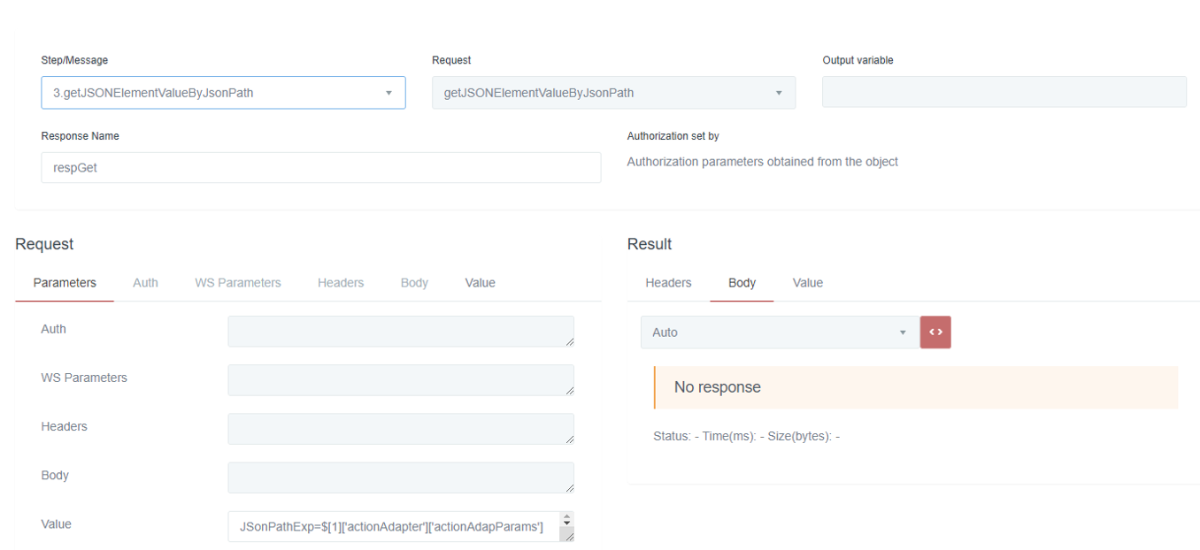 Description: if the content of the response to a request is JSON, this function allows to retrieve a value of an element used to identify the element the TagName. If there are more than one element, returns the first. The result is presented with the values separated by the character |, in the field Message / Result / Value.