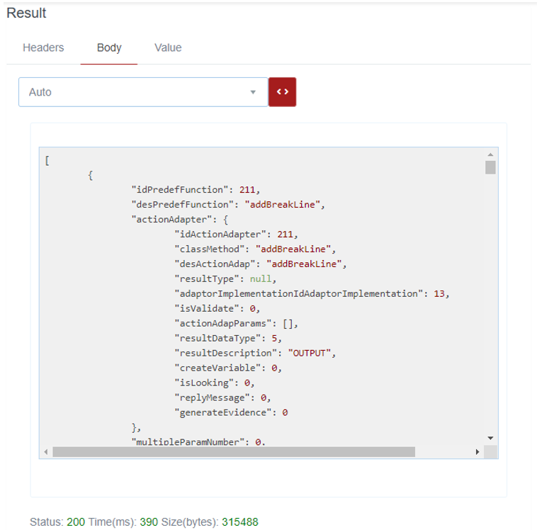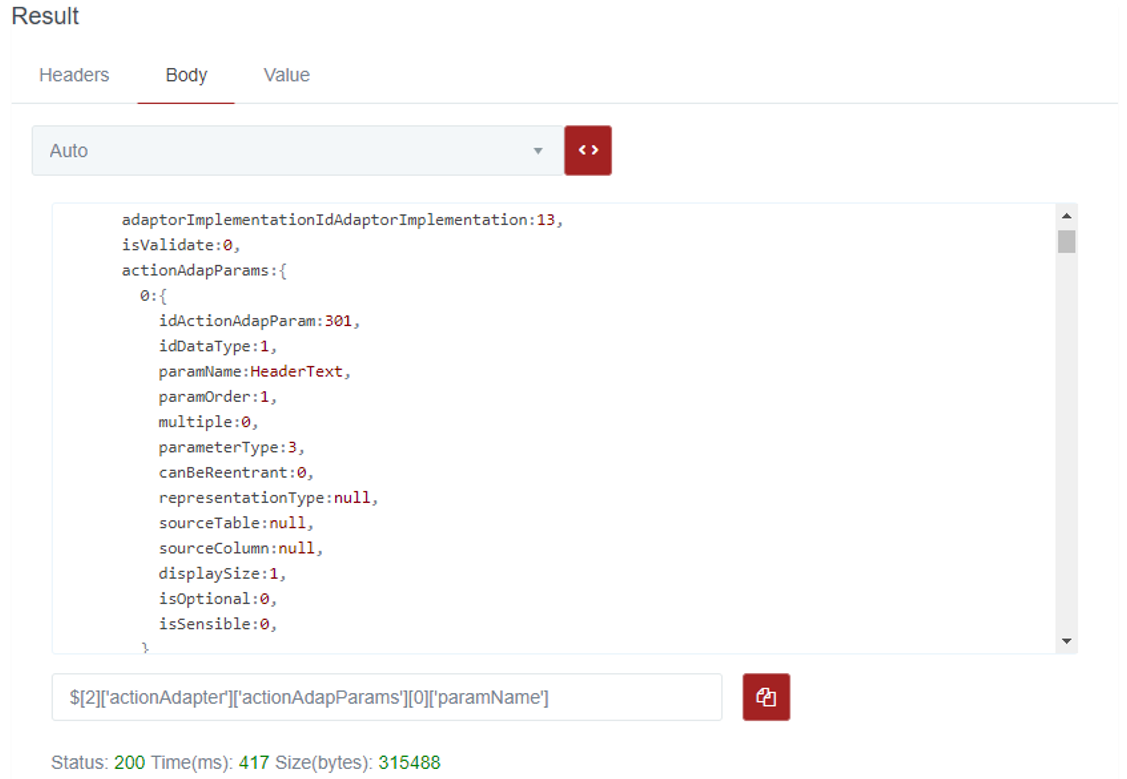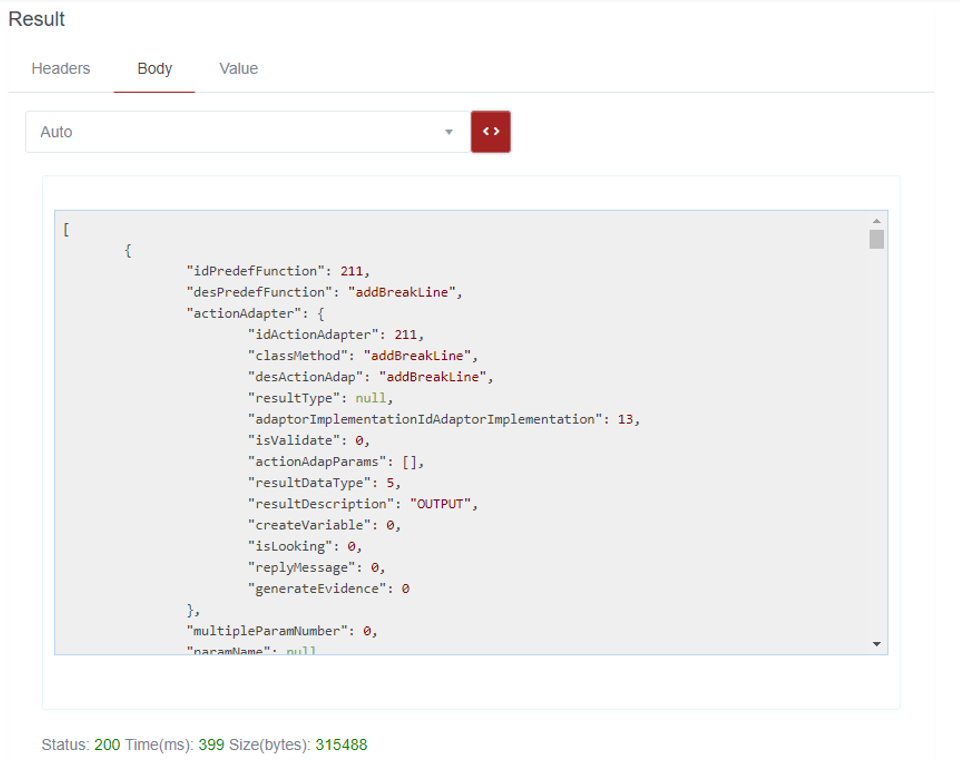 Description: if the content of the response to a request is JSON, this function allows to retrieve all the values of the element linked to the TagName as an array of values represented with a tastRowValues object. The result is presented with the values separated by the character |, in the field Message / Result / Value.