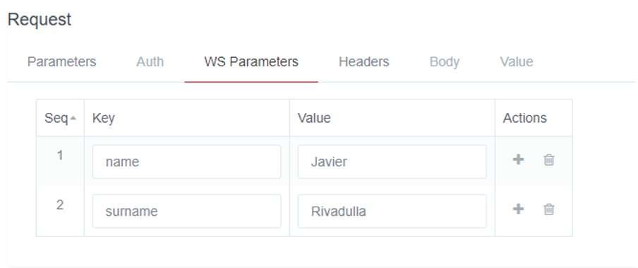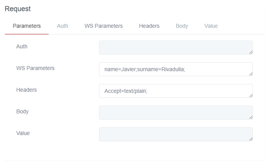 Rest of parameters of the requests: depending on the type of request, some input parameters will be enabled and will be displayed in the Parameters section, put in Message/Request.