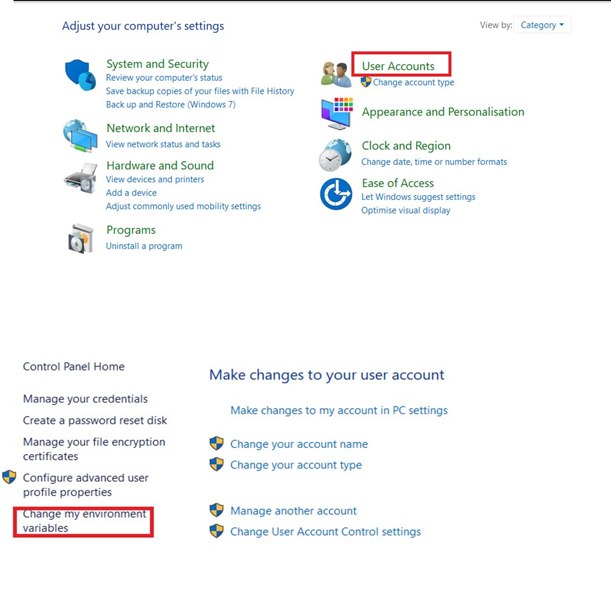 - Change the two environment variables: Run from the control panel → User Accounts → User accounts → Change my environment variables →