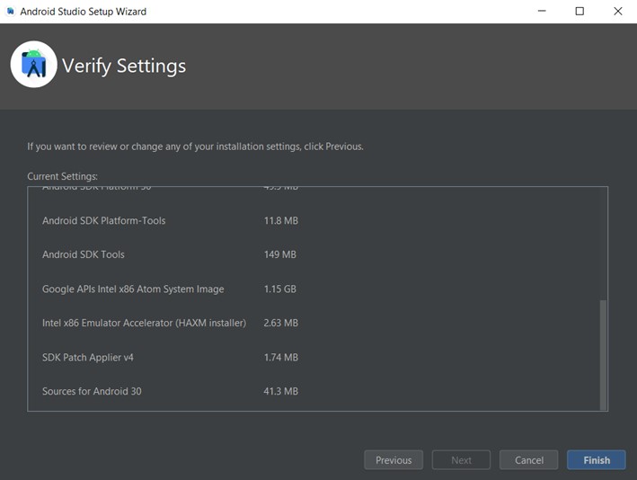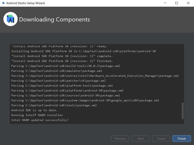 5. Once it finishes, click on “Next”, then “Finish” (with the box to initiate Android Studio checked).