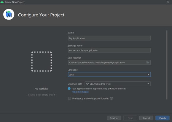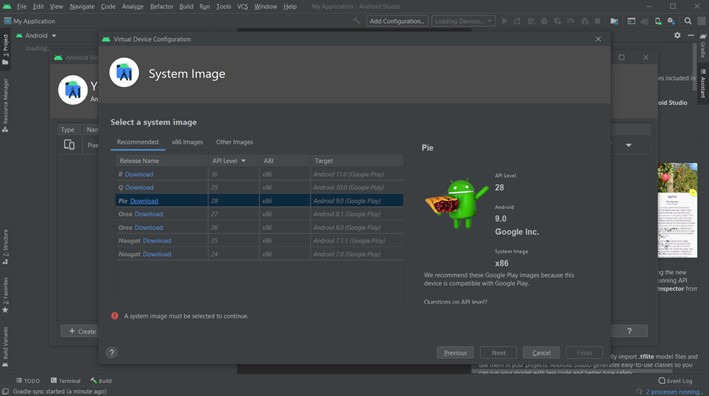 6. The first time you create a virtual device, it will ask you to download the API, we recommend installing level 28, which is Android 9.0, which is Android Pie. Select it and proceed with the installation clicking on “Next”.