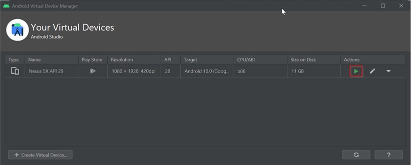 4. A pop-up with your available virtual devices will appear. To create a new one click on “Create Virtual Device…”.