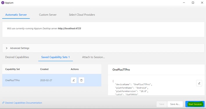 13. A new window will pop up. We need to click on “Desired capabilities” and in the JSON Representation something like this: