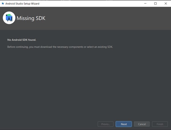 Android Studio welcome page will appear and you can start setting it up. You will see a message saying that the SDK is missing.