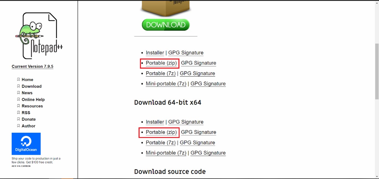 - Download the latest release of the Portable (zip) version of Notepad++ from the following link: https://notepad-plus-plus.org/downloads/. For 32 bits if your system is 32 bits, and 64 if your system is 64.