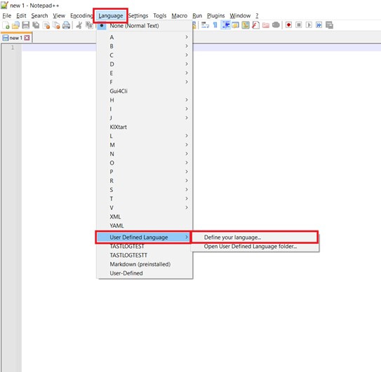 - Open Notepad++ and go to Language → User Defined Language → Define your language.
