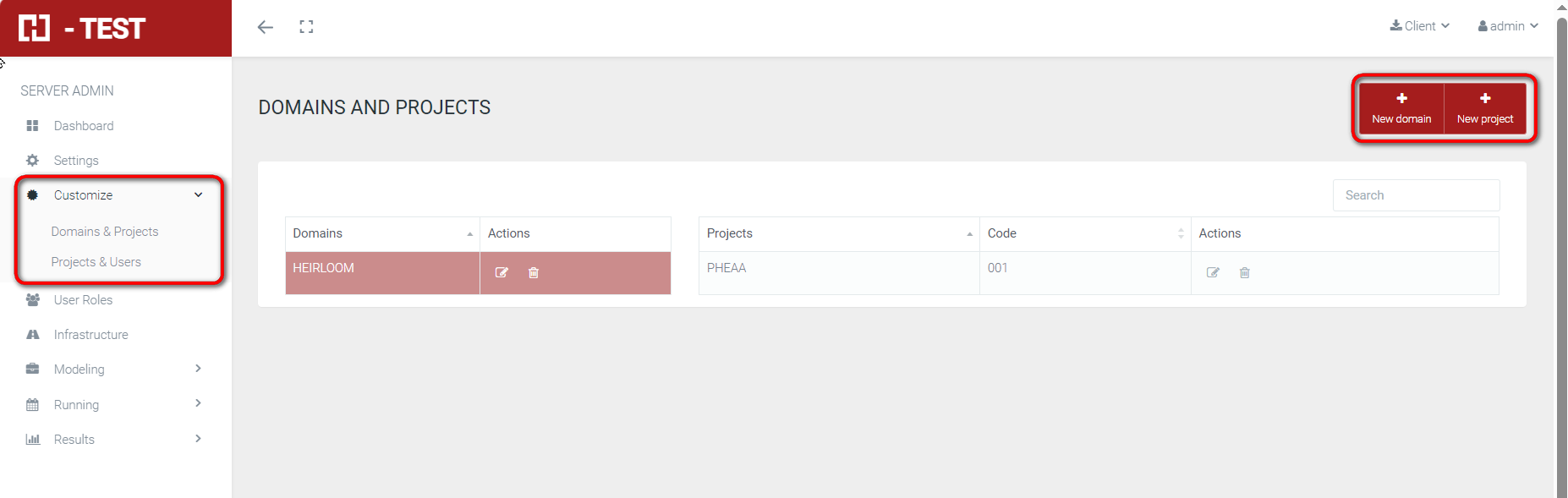 This option of the H-TEST tool allows the administrator to define domains and projects, also includes the assignment of projects to users.