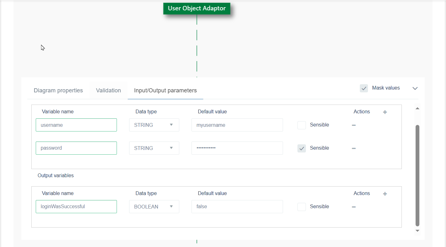 Here you can see how the input and output parameters of a diagram are defined. The parameters that are defined in this tab will be available in the diagram from the first step as variables. The default value will be used to execute the validation of the diagram. Without being used as a gate in another diagram, in the case of the output parameters, the initial value of the variable will be modified during the diagram execution.