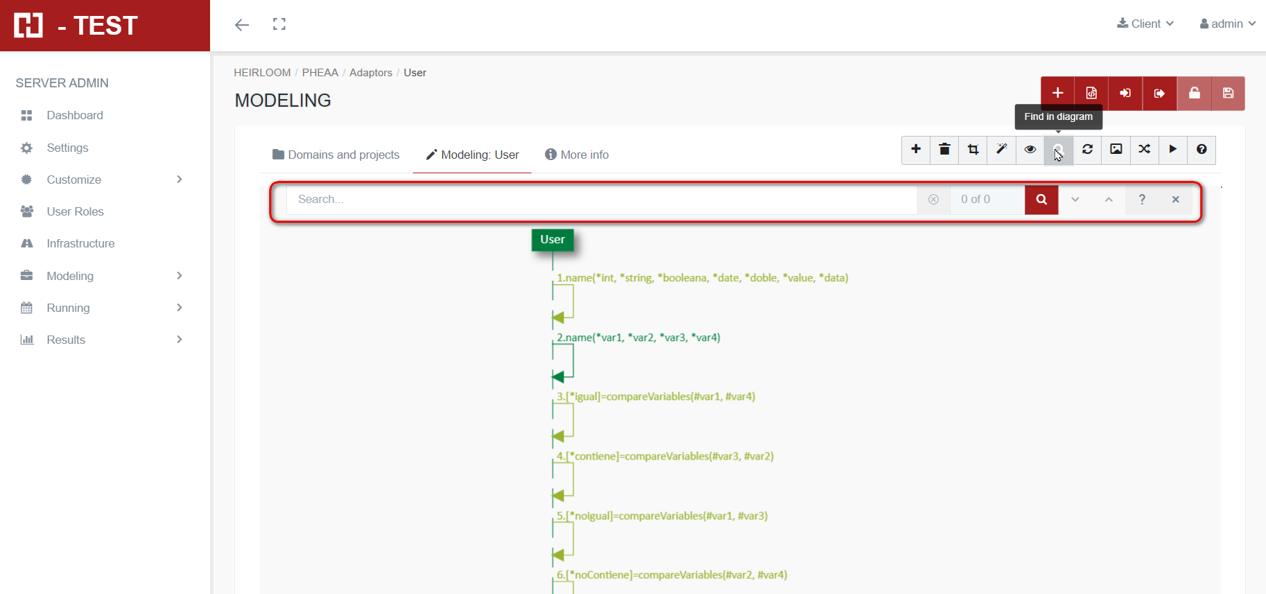 Once we enter the string to search for, and pressing the Enter key or the Magnifying glass button on the form, all the elements of the diagram that contain said string will be searched for, in any of its fields.