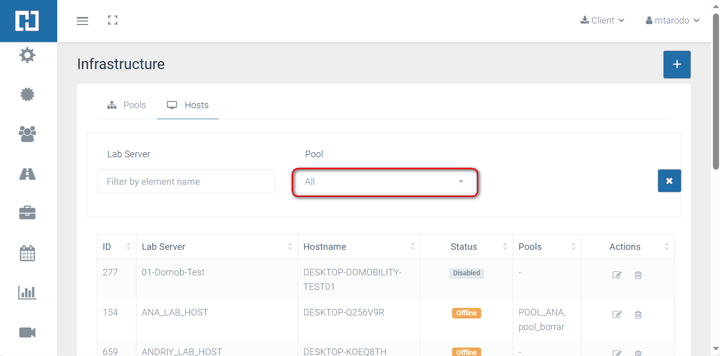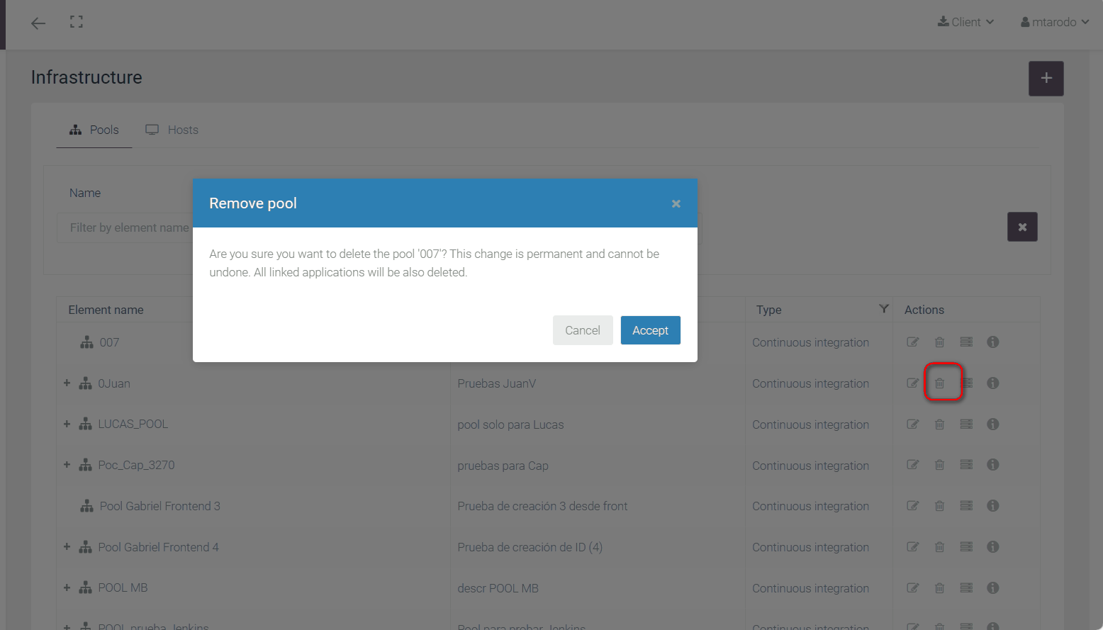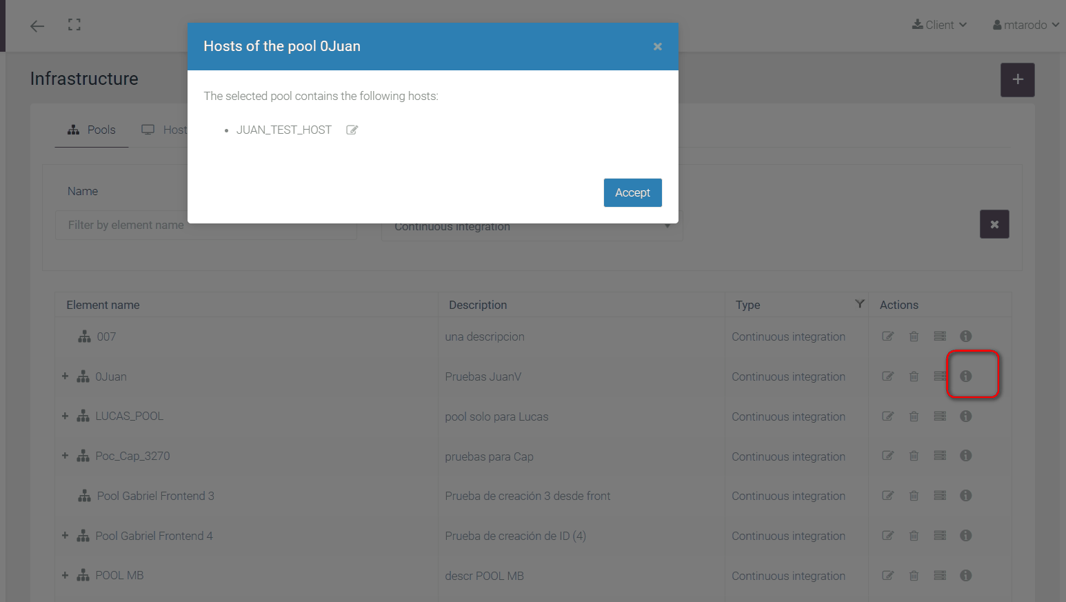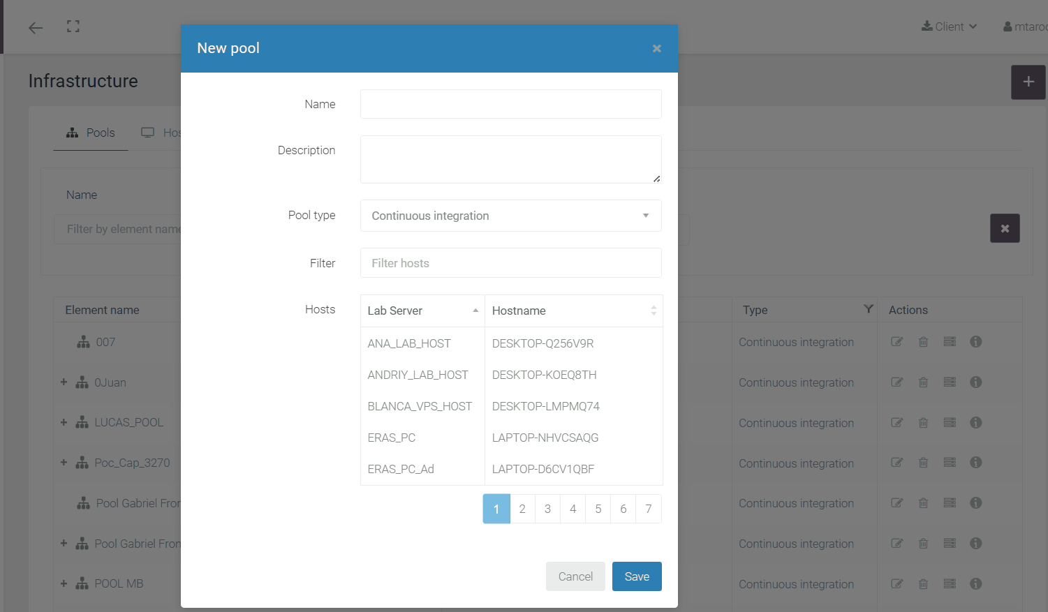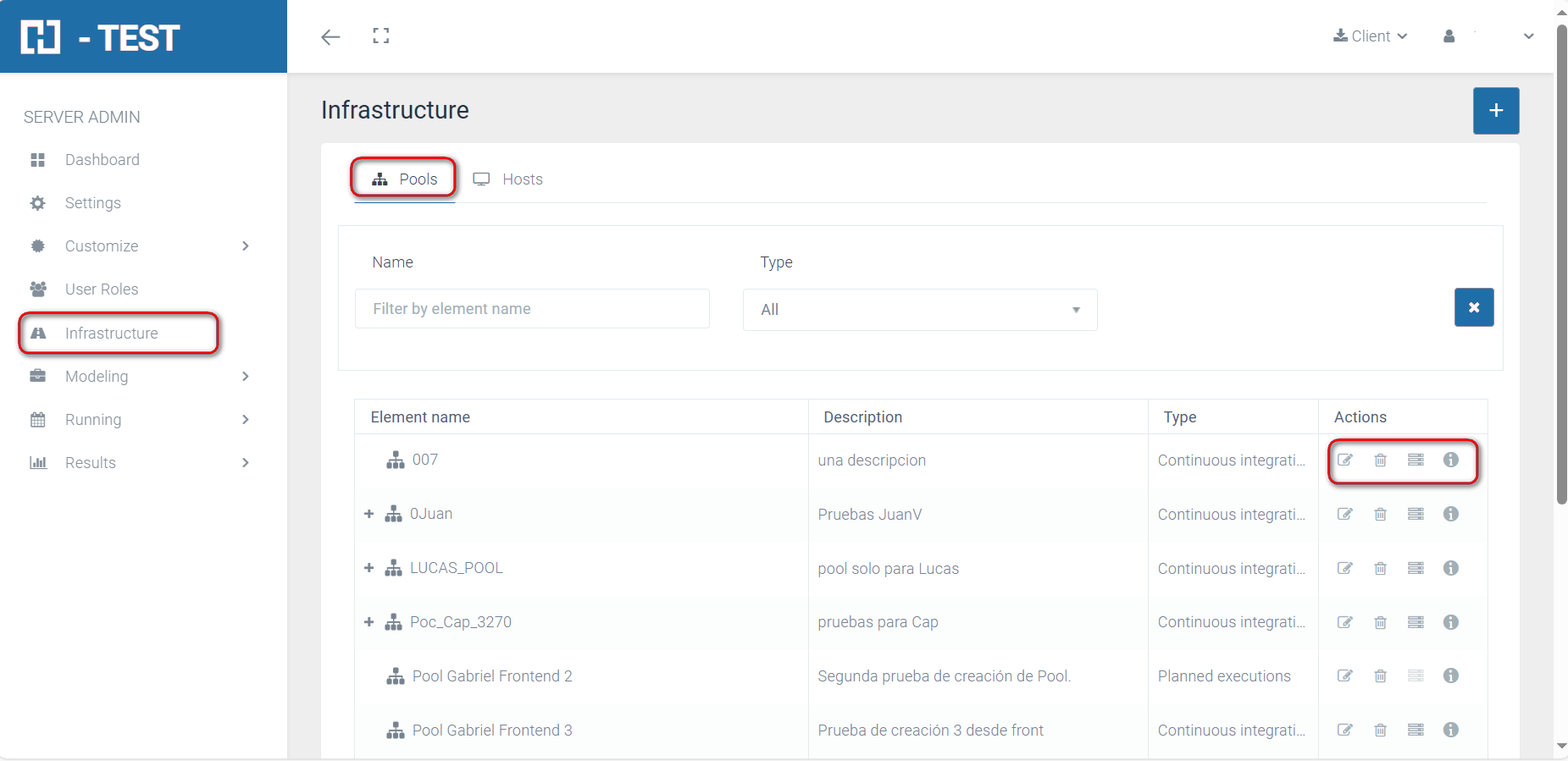 By default this is the first screen you will see when clicking on “Infrastructure”. It shows a list of all the existing Pools, together with a description, Type (Continuous Integration/Planned Executions) and a set of actions. This list can be filtered using the “Name” field or the Type dropdown list; both are placed above the list.