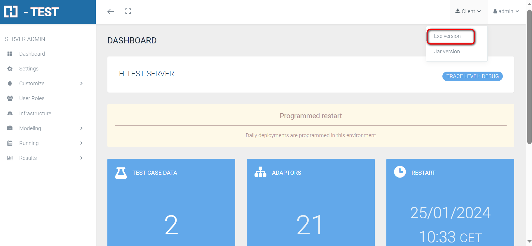 To use this launcher, we are going to start from the basis. First of all, we have to download it. To do that, we have to go to H-TEST application and click in client, then click in exe version.