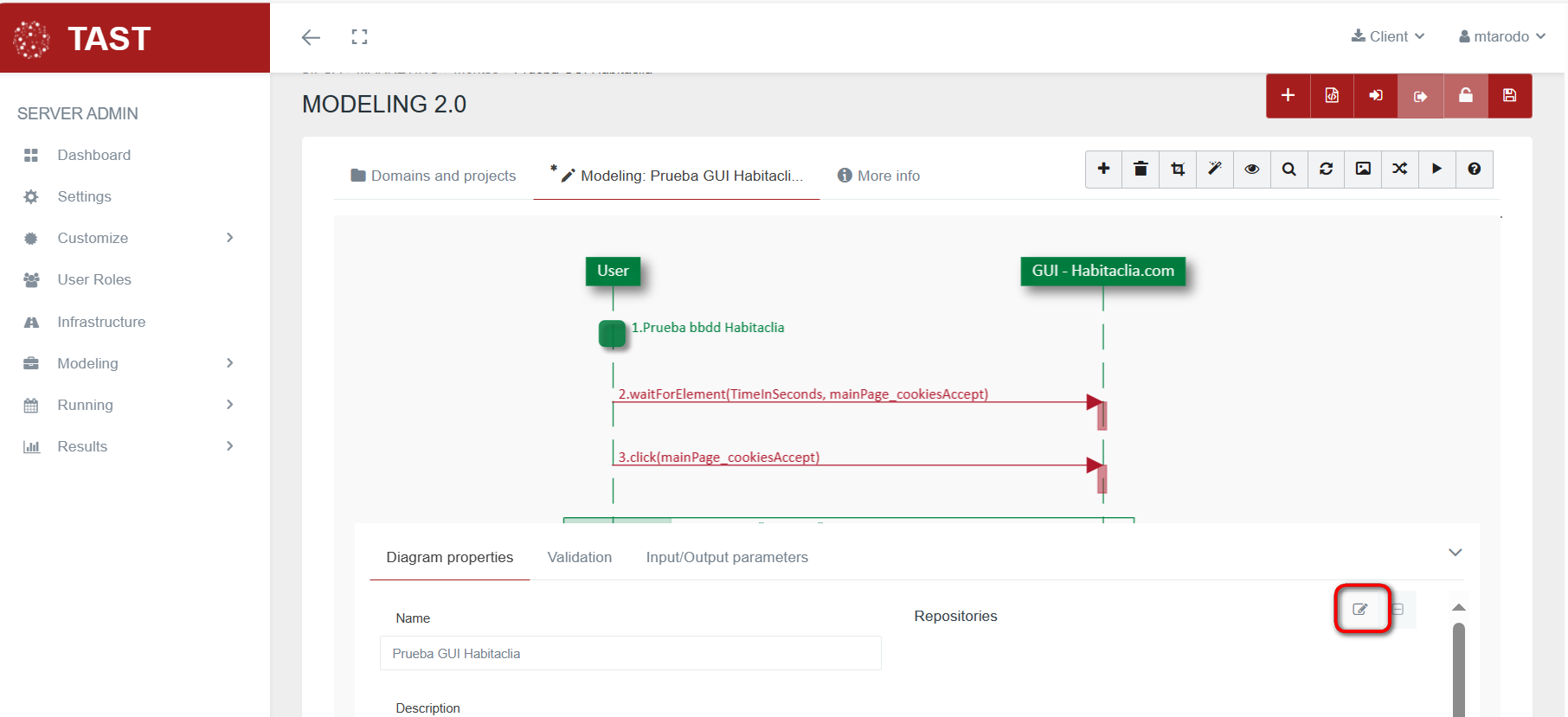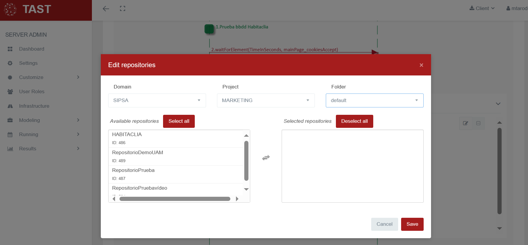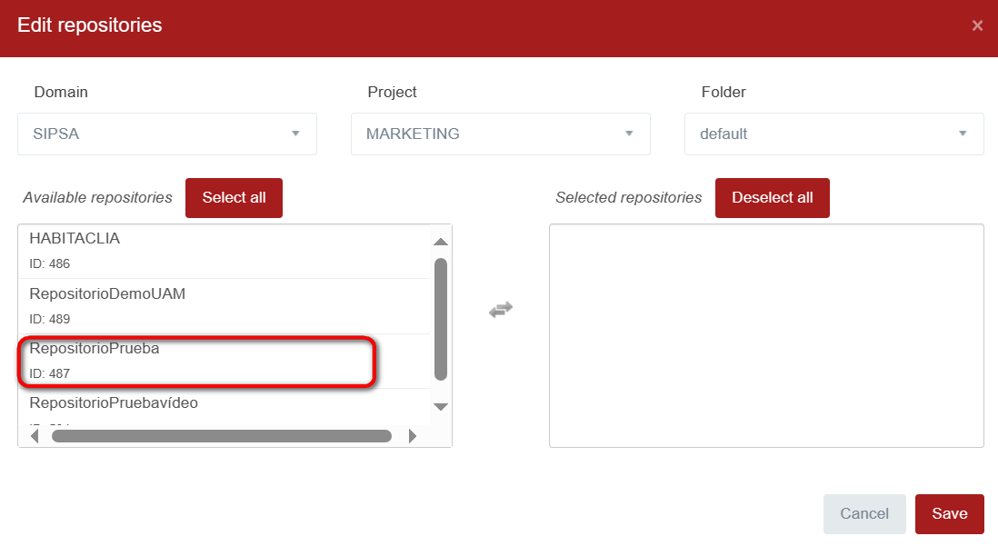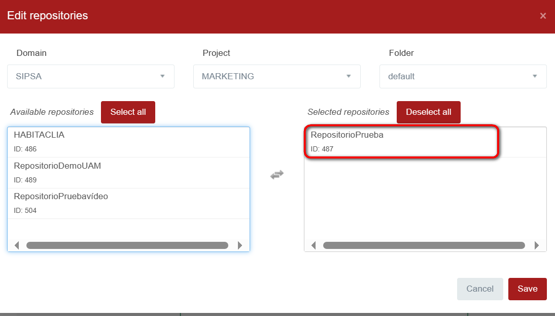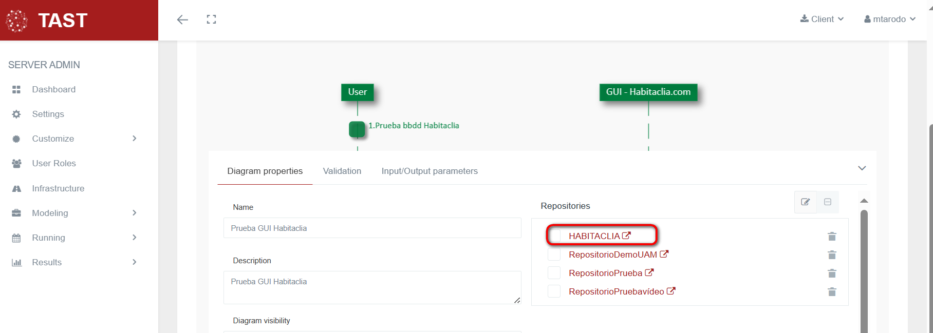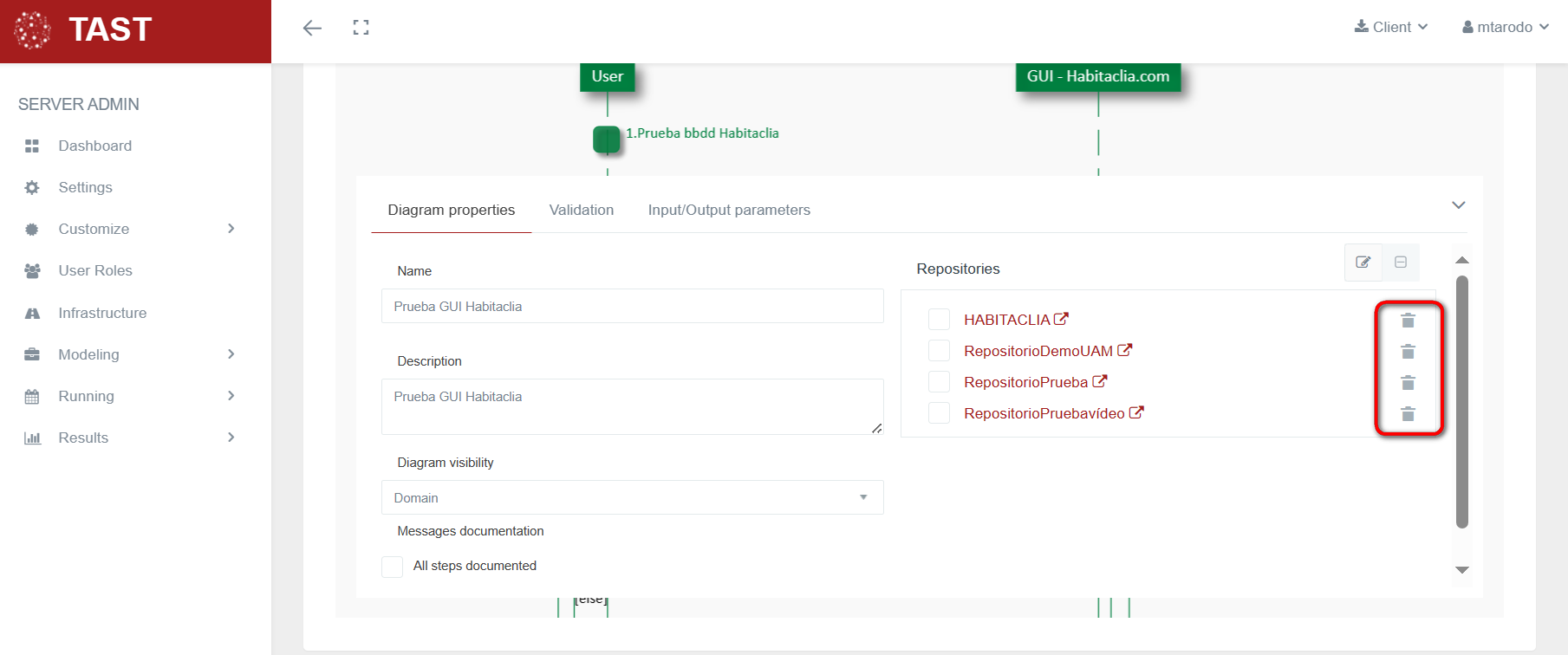- We can add or delete all the repositories we want. Once accepted it is saved and the diagram is updated with the repositories in the “selected repositories” list box, also this can delete old repositories from the diagram in case there was any and add new ones. Although the repositories are enabled immediately after selecting them, the relation repository-diagram can´t be confirmed until the diagram is saved.