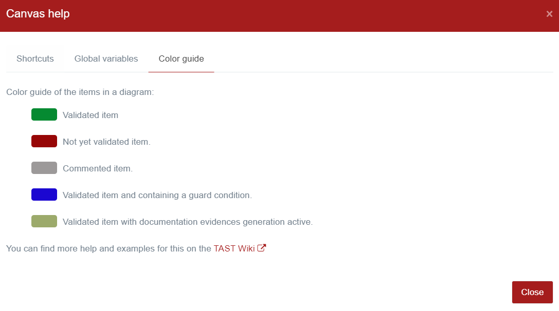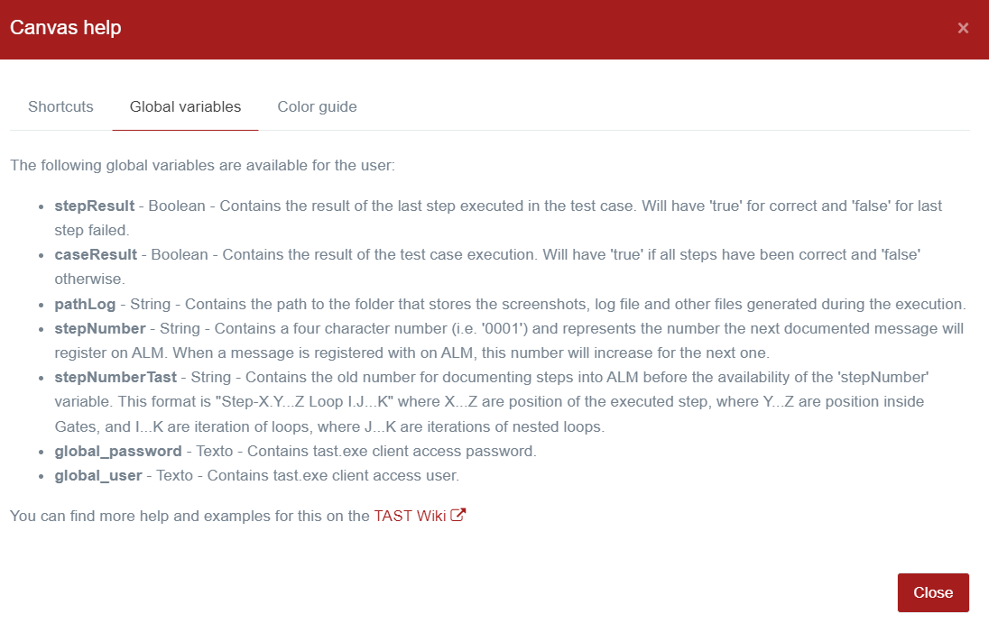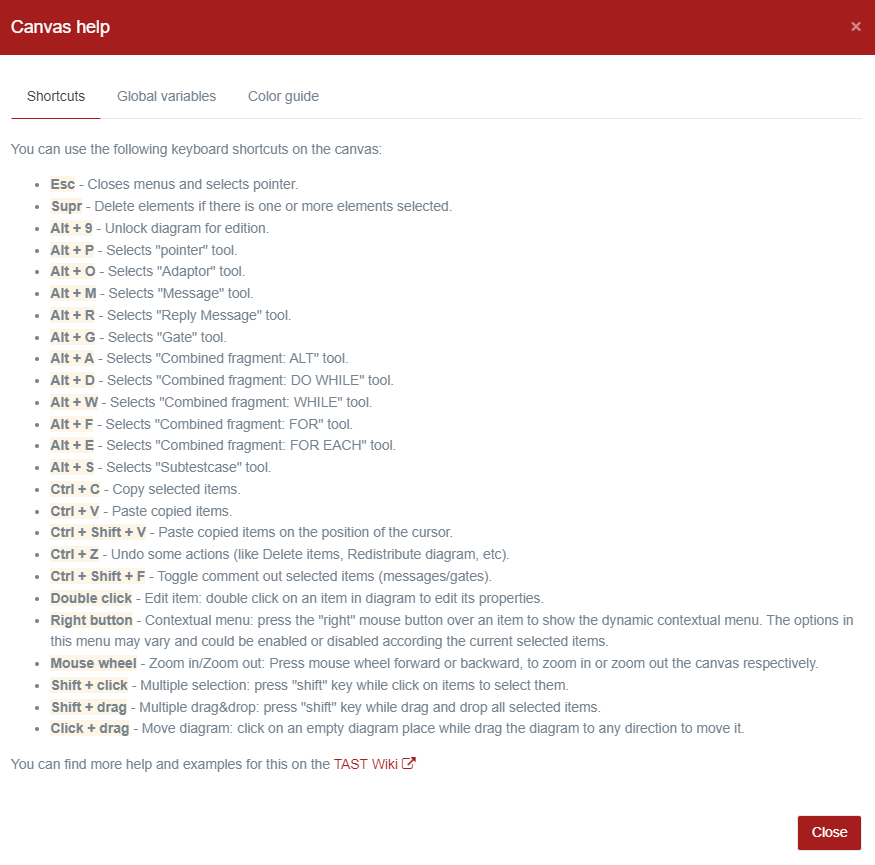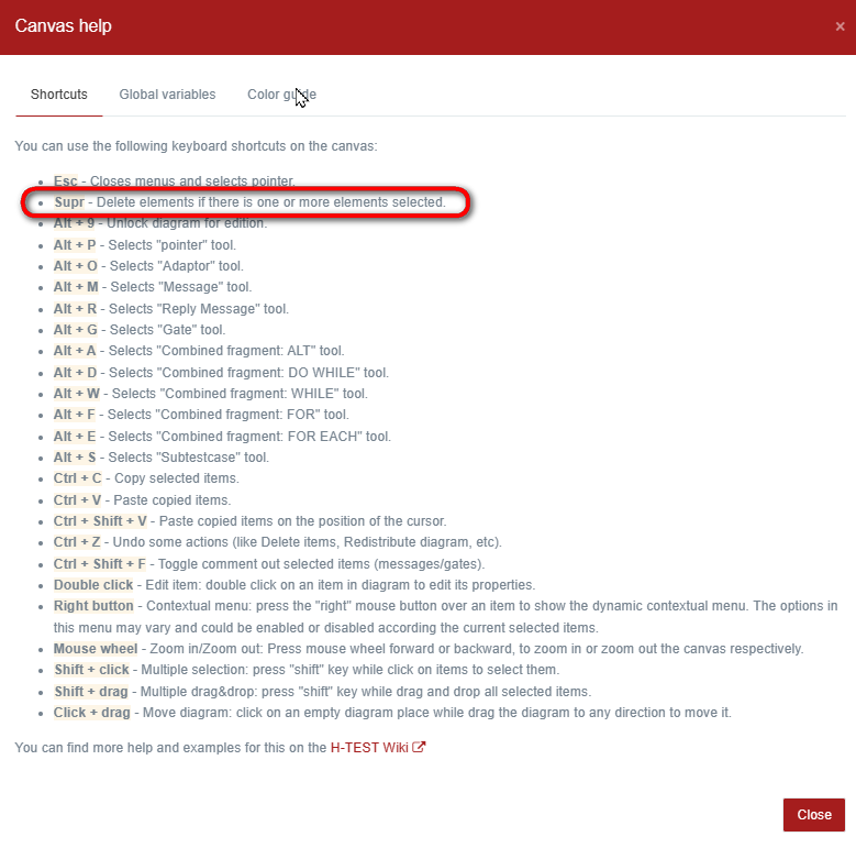 Show Canvas help: a modal appears with 3 tabs (Keyboard shortcuts, Global variables, Color guide) where the basic Canvas help is shown.