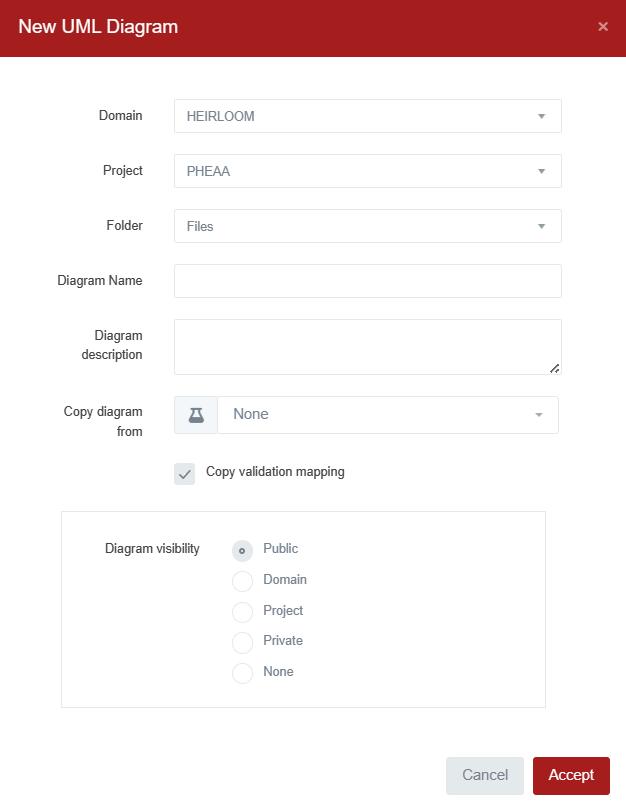 When choosing to create a new UML diagram, it is needed to click on the “New diagram” icon (+) in the tab located on the upper right side. After this, a new window will open as shown below: