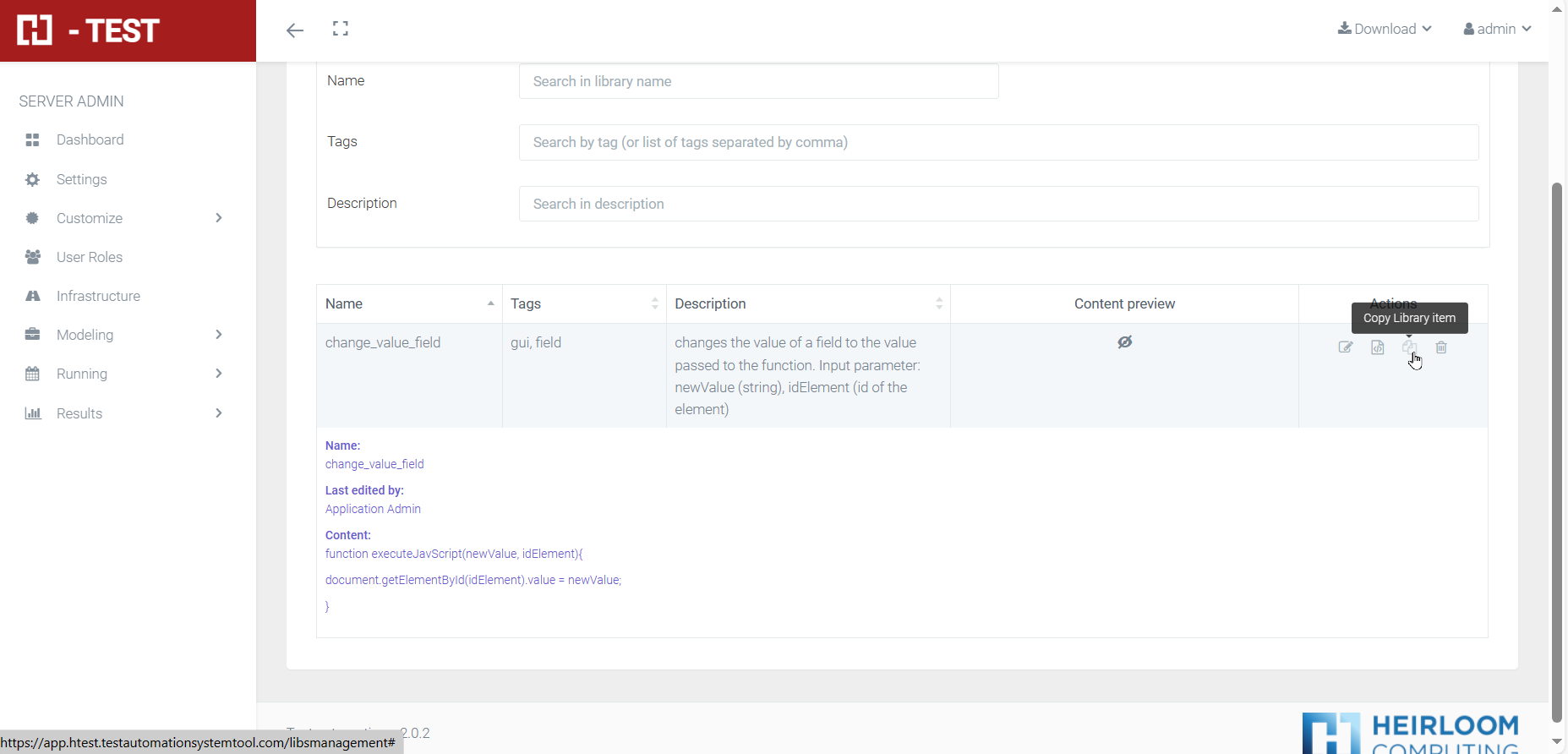 Clicking the Copy library item button in the Actions column displays a form to copy this item, for example to another domain or project, and allows you to modify certain fields such as Name, Tags or Description.