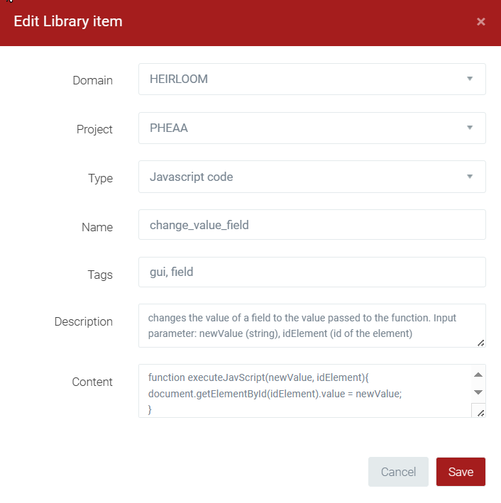 Clicking the "Create new library" item button from the Modeling Javascript/Sql code editing window, which will automatically launch the Library Management page in a new tab of your browser, with the Create new library item form open and with the Domain, Project, Type and Content fields already filled in.