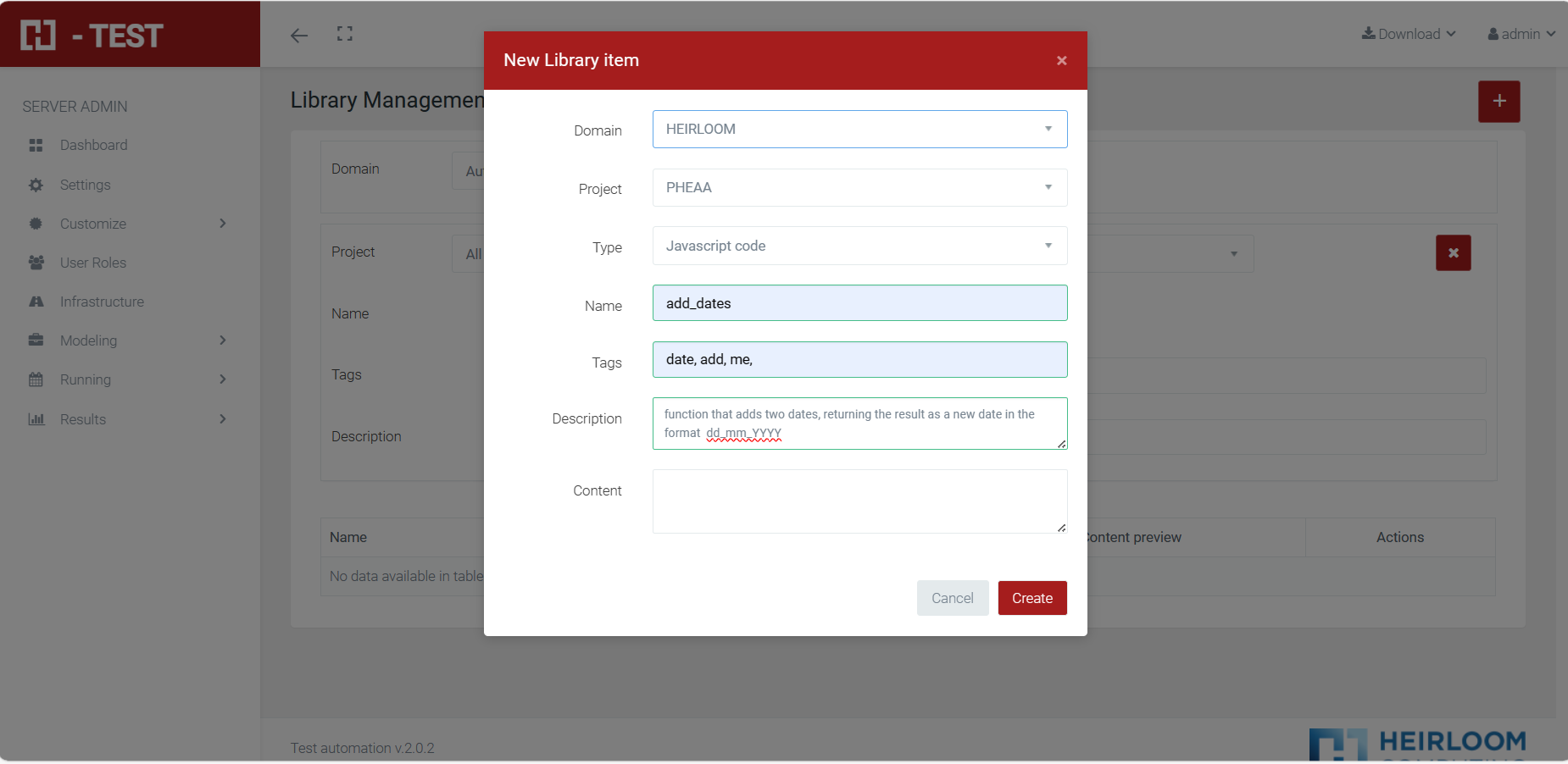 In the Library Management screen the user will create a new item, then copy the Modeling code and finally paste it into the Contents field of the new library item.