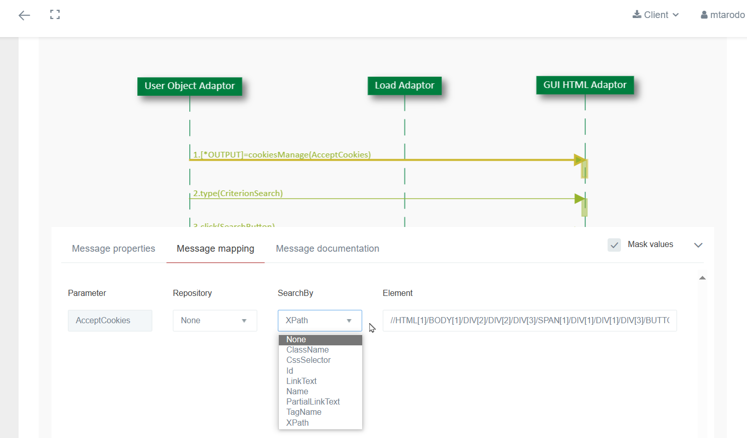 As H-TEST user, it is possible to work with them. After creating the messages (let us use the CLICK message as an example), and the parameters needed for it (for instance, clicking on the LOGIN button), we can select how to identify the button.