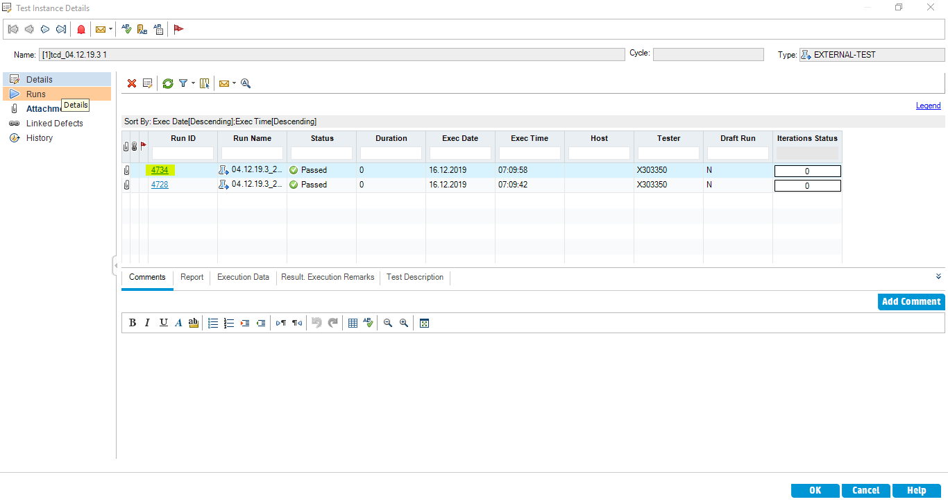 Consecutively in the “new test instance“ details window we have to click in runs and then choose the run ID (and click it), for example: