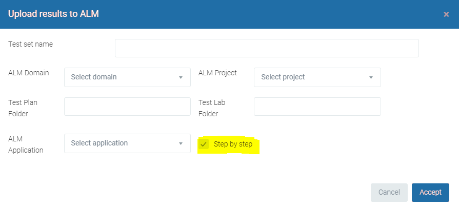Once the pop-up appears, we have to select the checkbox of “Step by step“ if we want to activate this new functionality and save the results by steps in ALM.