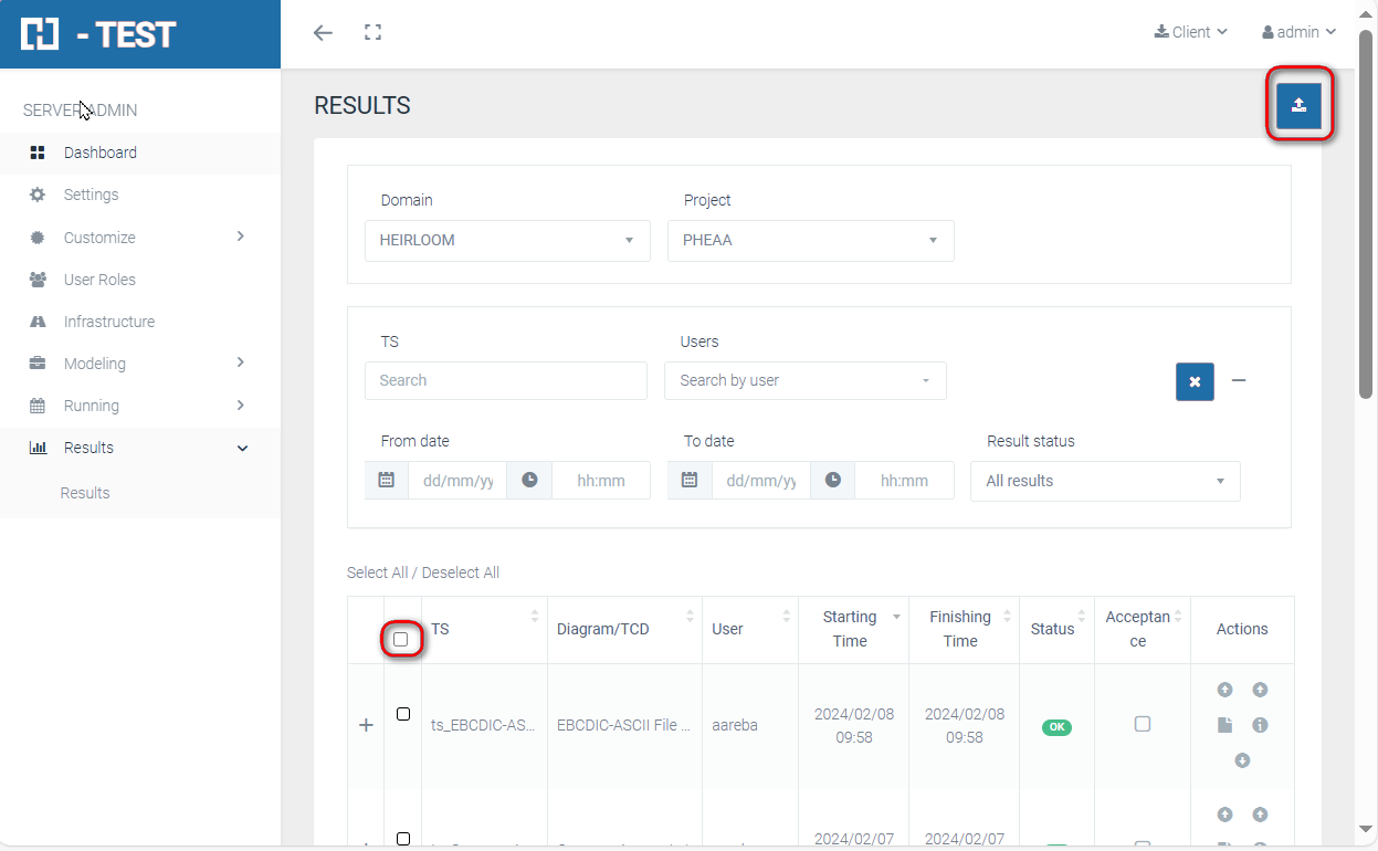 This option allows to upload to ALM a Test Set, or a group of them. You can use the data fields to filter the results list. If you want to upload a set of TS as a result of your filter, you can check-in the “Select all” check/box and all the elements displayed will be selected. The check box is located on the left side of the List headers.