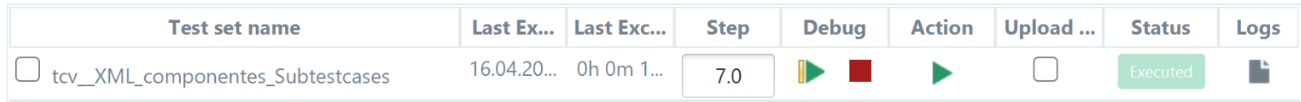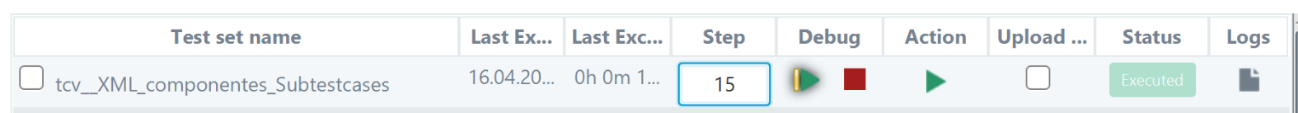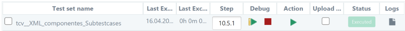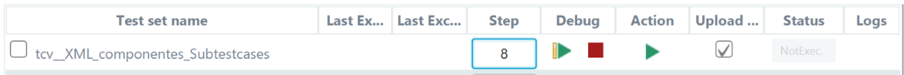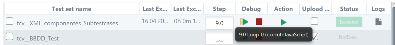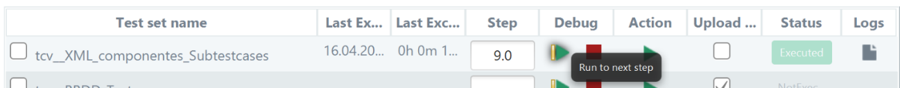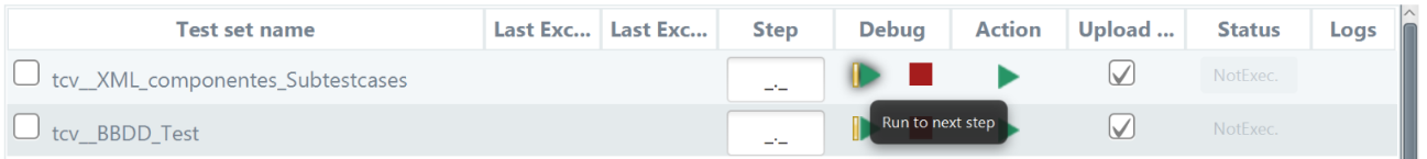 From the Debug column, the user will be able to tart/continue, or stop the debug execution of a TCV. The Step column will show the evolution of the TCV debug mode execution, and it also allows the user to enter, if desired, the step to which he wants to go forward. Once the execution in debug mode has started, the Step field will always show the last step executed, as well as information related to it.