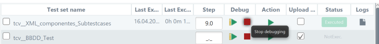 At any time the user will be able to stop the execution of a TCV in debug mode, by pressing the Stop debugging button in the Debug column.