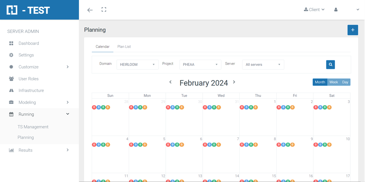 In this Running option, you can see a calendar with the status of the existing plans for a Domain, Project, and, optionally, for a Specific Server: